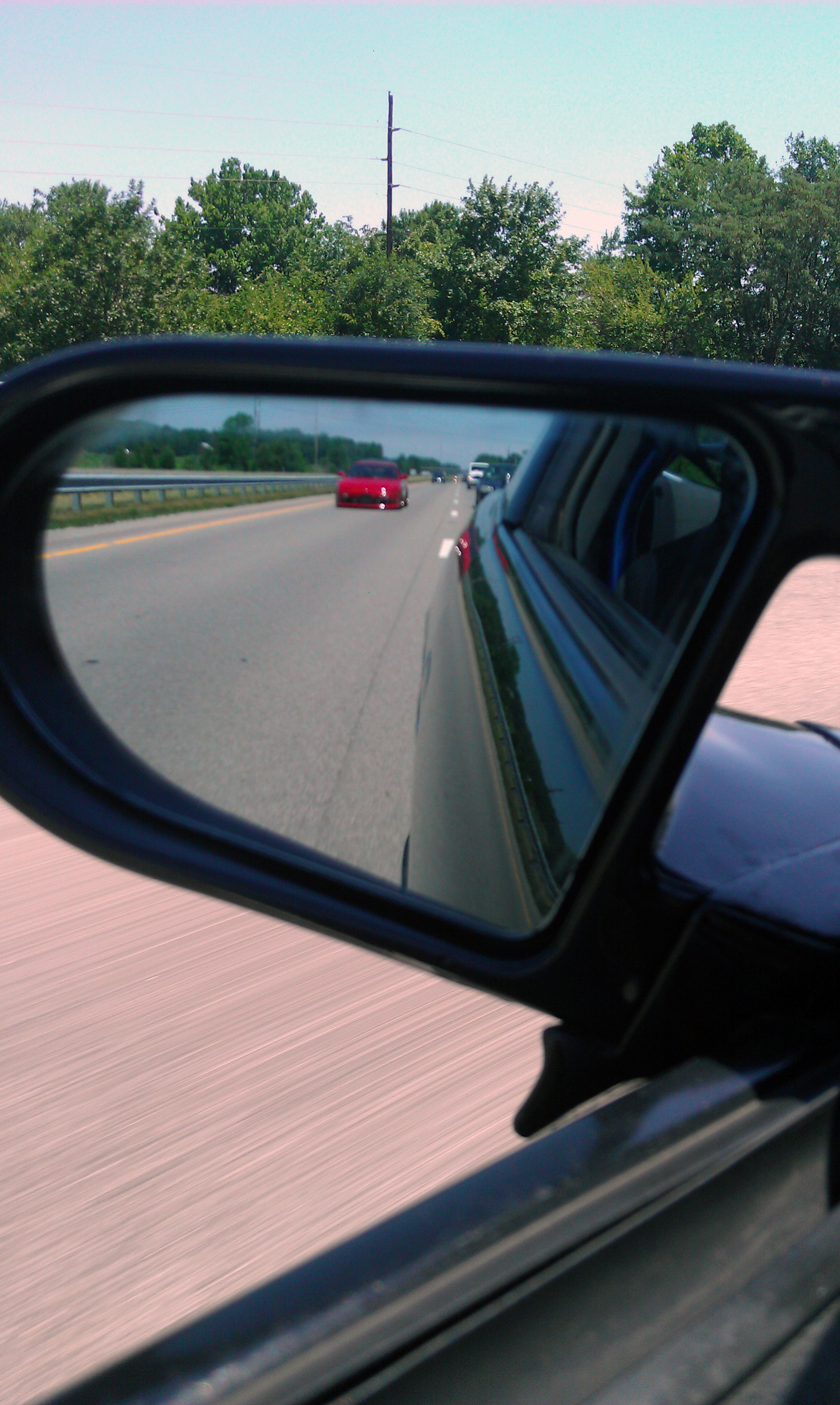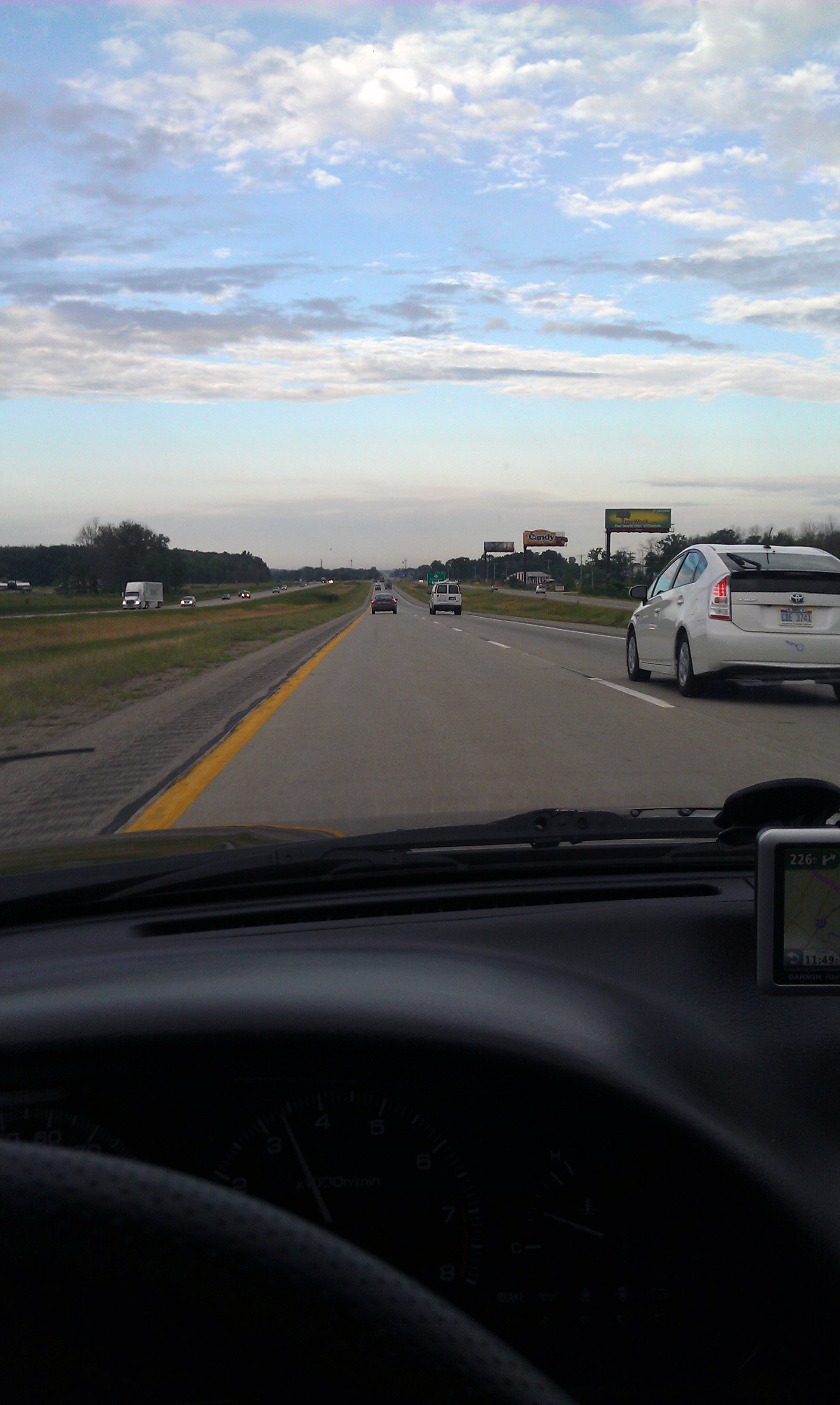 I think we got up at 6:30 on Friday morning and were on the road by 7. It had rained overnight, which was a surprise and was not in the forecast, so washing my car was sort of a waste of time. Naturally, by the time we were through Lansing, the skies cleared up and the tiny blip of rain that had been hanging over us was gone. Here we are after hopping on I-69 from I-96, about 40 minutes into the trip: