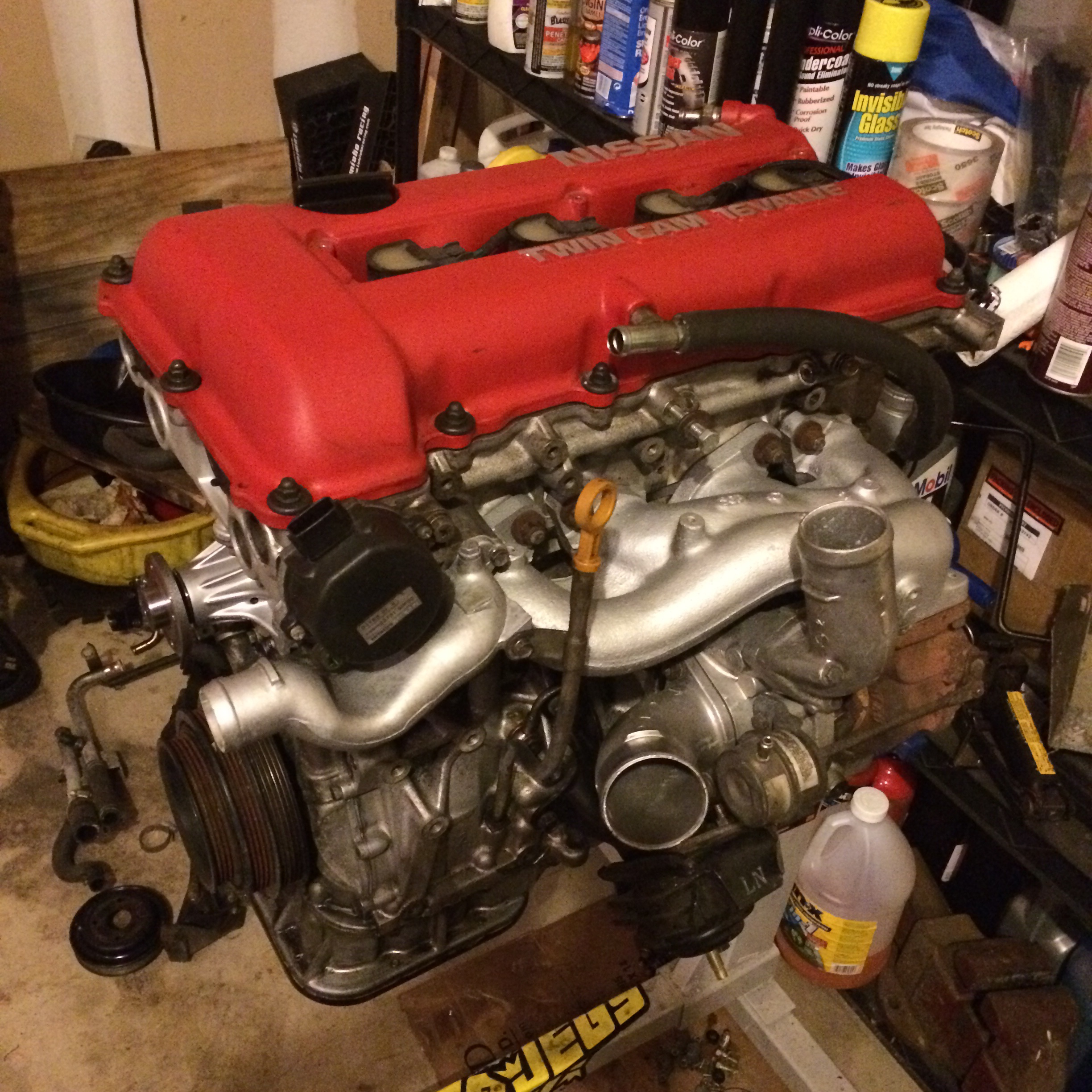 I spent some time in the cold garage last night and managed to get the exhaust side of the engine back together. Painted the exhaust manifold, installed all new gaskets, cleaned the block, put the new water pump on, and installed the NISMO engine mount on that side.
