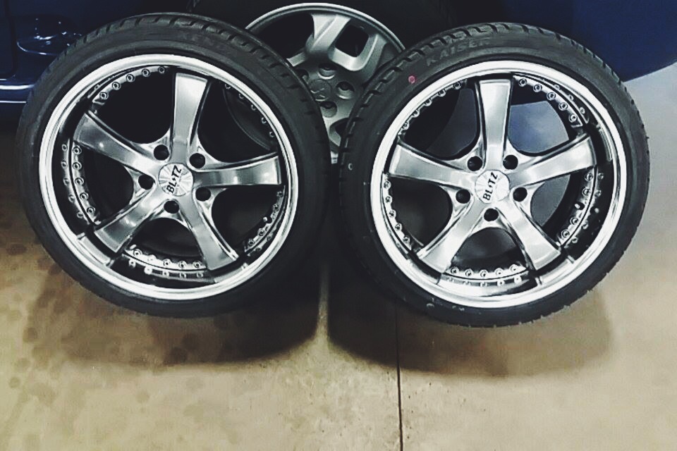 A friend sent me this photo after mounting up my front tires for me today. 215/40/17 Kenda Kaiser on 17×9 +15 Blitz Techno Speed Z2. I tried really cheap tires this time because I’m just going to ruin them anyway.